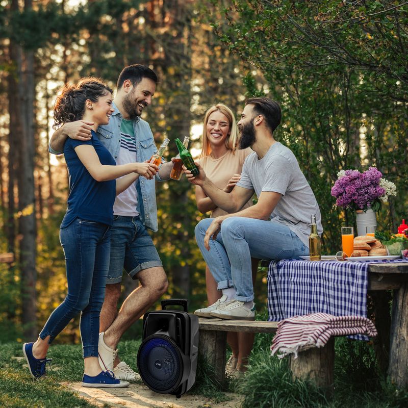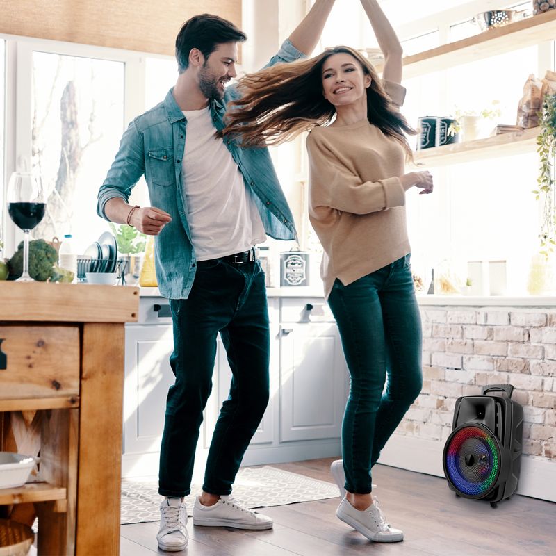 Ofrece reproducción de audio vía Bluetooth, USB, MicroSD (hasta 32 GB) y radio FM, además de contar con entrada auxiliar de 6.3 mm para micrófono, ideal para sesiones de karaoke. Sus luces LED multicolor con diferentes secuencias añaden un toque visual dinámico al ambiente.
